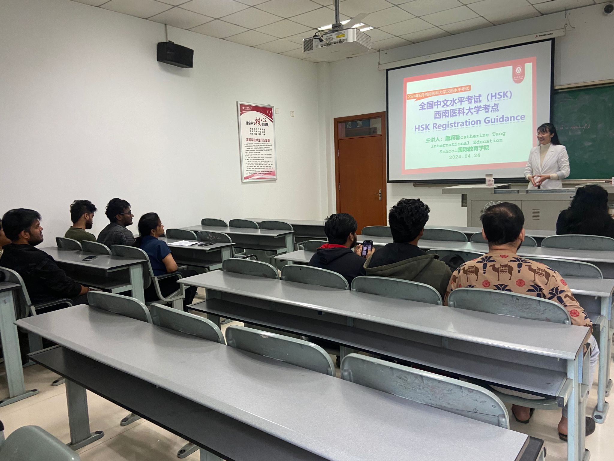 文化悠悠传千载,才思灼灼传未来。为进一步做好beat365官网全国中文水平考试(HSK)考点宣传工作,4月24日下午,国际教育学院在忠山校区粒香苑403教室组织开展了以语言为桥 赴中文之约——全国中文水平考试(HSK)beat365英国官方网站考点考试报名宣讲会,beat365官网来自忠山校区临床医学专业(英语授课)的留学生参加了此次宣讲会。