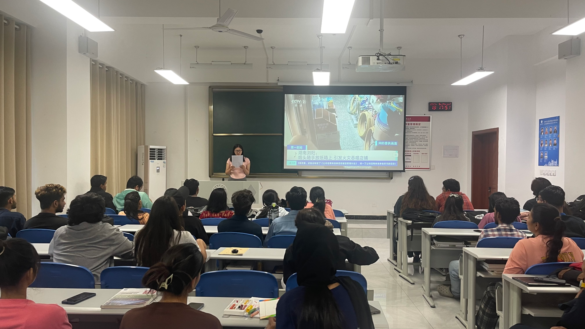 在活动前期准备阶段,辅导员们在教学楼、学生公寓等关键区域张贴禁烟标识及海报,同时向学生发放健康科普资料,旨在让学生深刻领会禁烟的重要性。5月15日,学院在两校区开展“Tobacco and Alcohol Free Campus”禁烟、禁酒讲座。通过国际学生辅导员讲述“一个烟头引发的火灾”等案例,使学生直观感受到吸烟带来的严重后果。会后,国际学生集体签订“无烟校园”倡议书,书写自己对维护校园无烟环境的承诺,进一步增强了禁烟意识。
