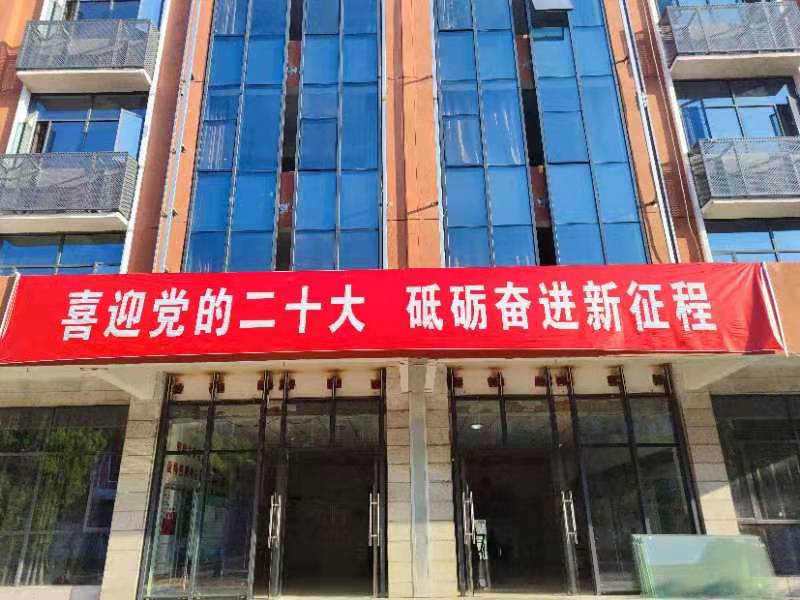 (ac米兰官网中文网站立信楼大门悬挂喜迎党的二十大横幅)