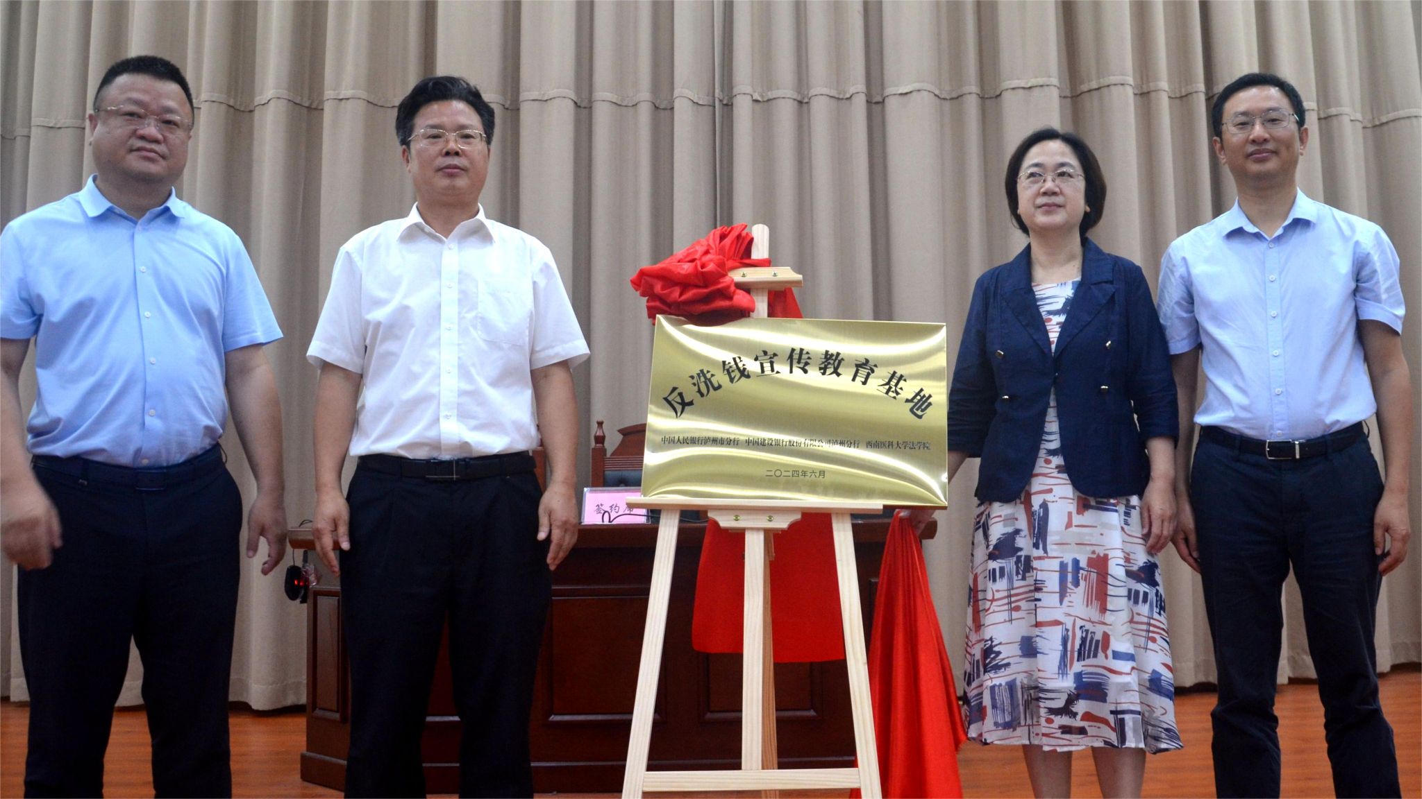 为进一步加强反洗钱宣传教育,筑牢反洗钱防线,推进平安校园建设,强化在校学生对洗钱风险与危害的认知,增强在校学生反洗钱意识及自我保护能力,6月19日下午,由beat365英国官方网站法学院、中国人民银行泸州市分行、中国建设银行股份有限公司泸州分行共同建立的反洗钱宣传教育基地揭牌仪式在beat365英国官方网站模拟法庭举行。学校党委副书记、工会主席刘毅出席揭牌仪式并讲话。中国人民银行泸州市分行党委书记、行长肖华轩,党委委员、副行长王岚,中国建设银行股份有限公司泸州分行党委书记、行长邹凌云,党委委员、副行长袁东出席揭牌仪式。beat365英国官方网站法学院全体党政领导、中国人民银行泸州市分行代表、中国建设银行股份有限公司泸州分行代表、泸州市其他金融机构代表、beat365英国官方网站学生代表等200余人参加揭牌仪式。仪式由beat365英国官方网站法学院党委书记李星主持。