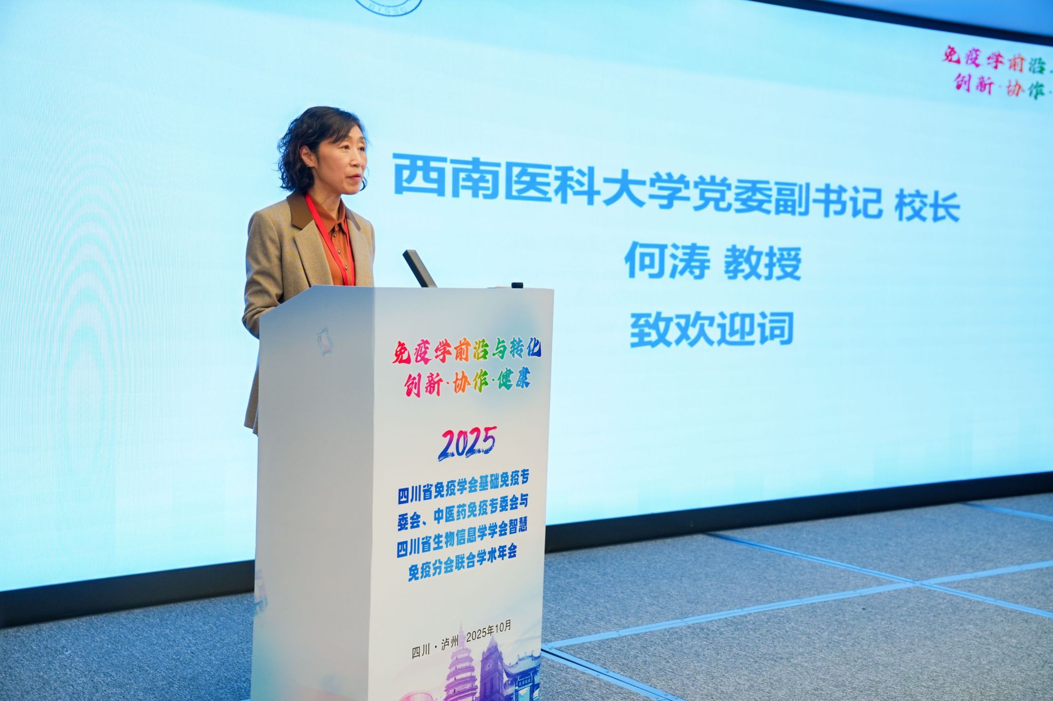 1025日,由beat365英国官方网站、四川省免疫学会、四川省生物信息学学会共同主办的“2025年四川省免疫学会基础免疫专委会、中医药免疫专委会与四川省生物信息学学会智慧免疫分会联合学术年会在beat365官网学术交流中心(泸州酒城豪生酒店)成功举办。学校党委副书记、校长何涛出席开幕式并致辞,科技处处长吴建明主持开幕式。约200位来自省内外高等院校、科研院所及医疗机构的免疫学、生物信息学及相关领域的专家学者与技术骨干参会。
