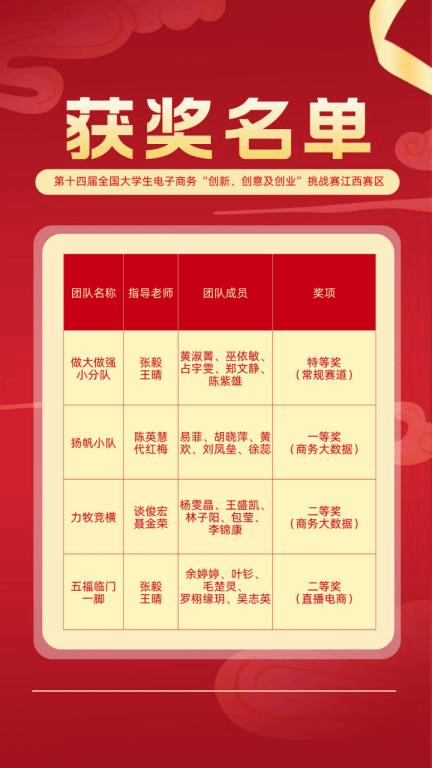 参赛团队“扬帆小队”、“力牧竞横”分获商务大数据分析赛道一、二等奖,“五福临门一脚队”荣获直播电商赛道二等奖,指导老师陈英慧、代红梅荣获江西省选拔赛“优秀指导老师”称号。