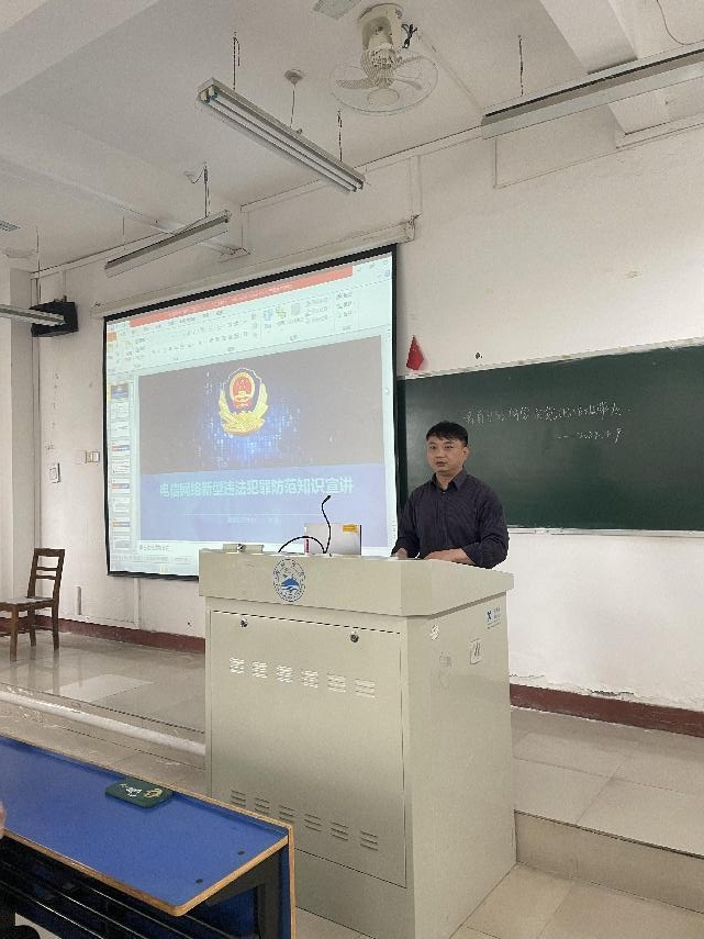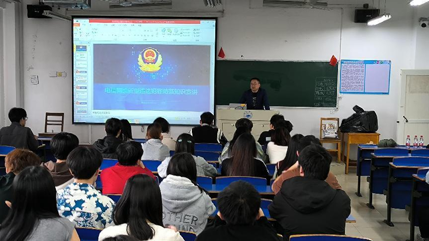 为切实增强我院在校学生的反诈意识和识骗能力,进一步提高学生的网络安全意识,有效防范网络诈骗案件发生,ac米兰官网中文网站特邀九江市公安局濂溪区分局反诈中心民警李清警官于4月10日下午来院宣讲电信网络新型违法犯罪防范知识。学院党委副书记周梓哲、学生管理科科长周龙波、大一大二大三年级各班班长、团支书参加讲座。讲座由周龙波主持。