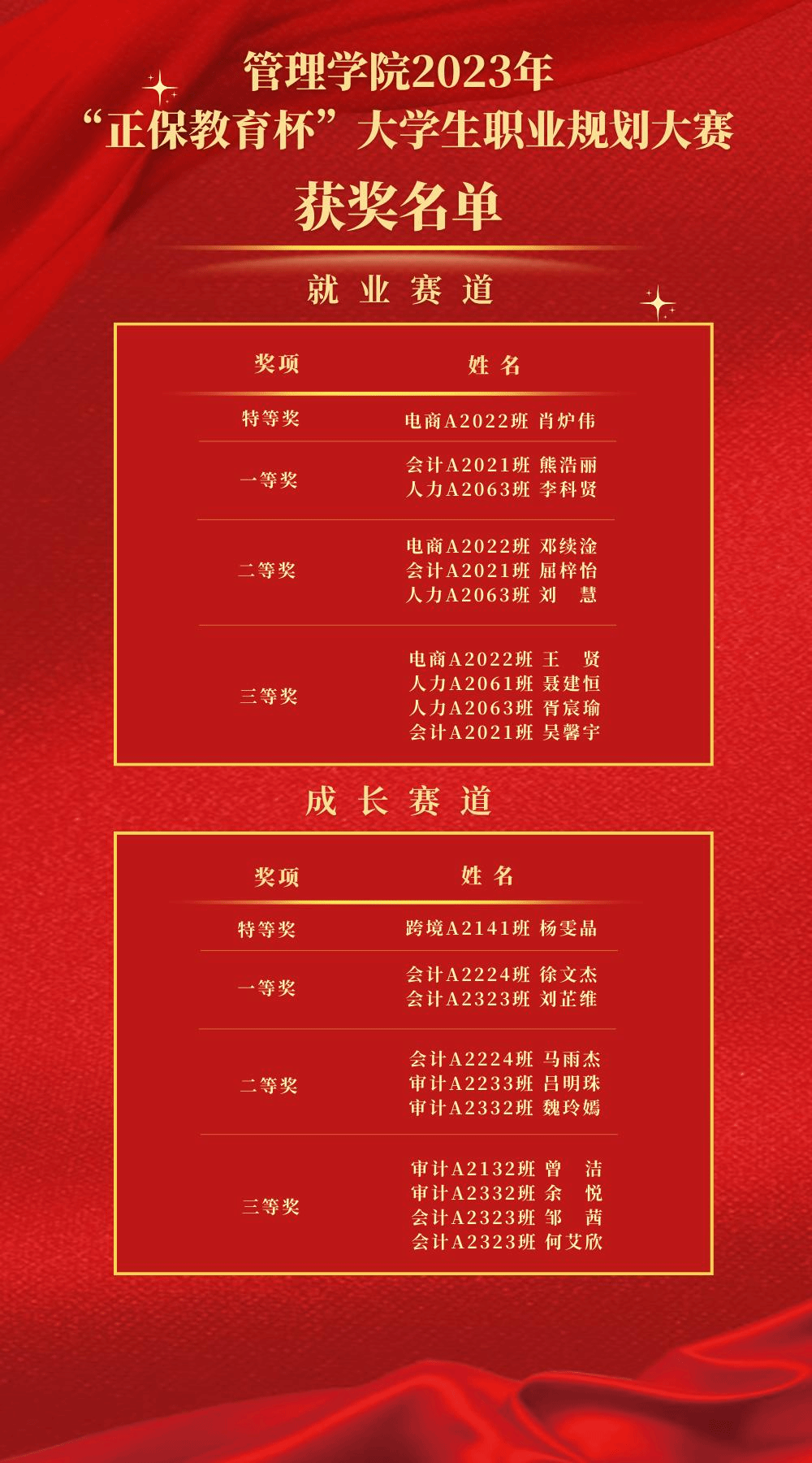 经选手展示与专家评审,电子商务A2022班肖炉伟、跨境电商A2141班杨雯晶分别获得就业赛道与成长赛道的特等奖。