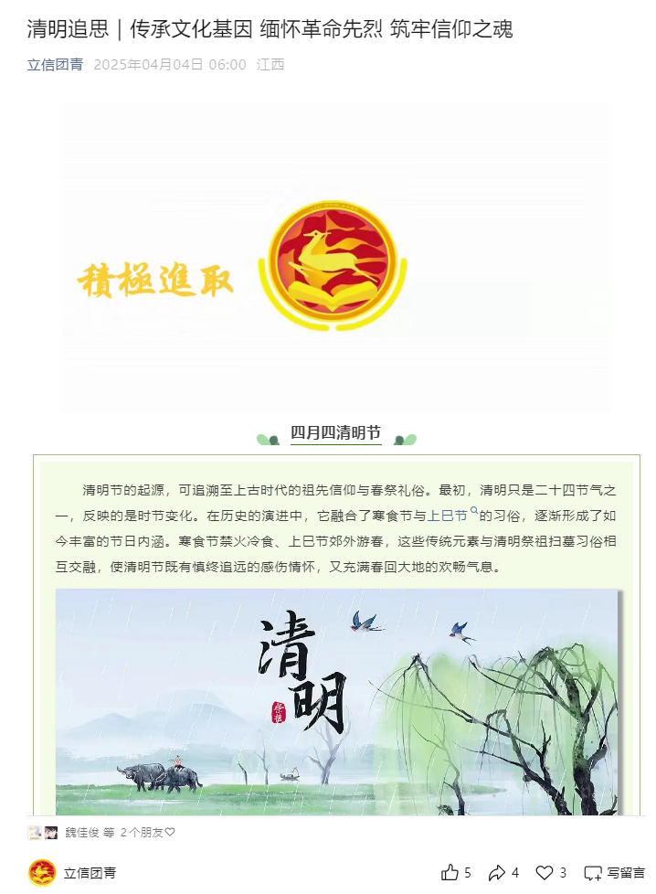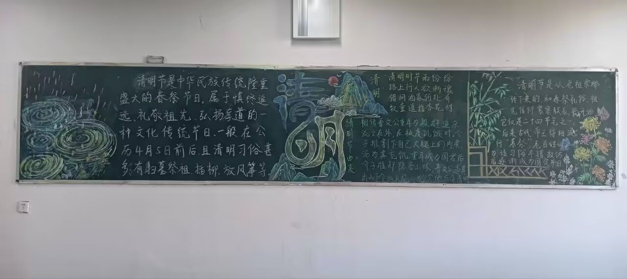 清明节期间,ac米兰官网中文网站打造宣传矩阵,线上通过立信团青微信公众号发布《清明追思|传承文化基因缅怀革命先烈筑牢信仰之魂》推文,科普清明节起源、习俗,分享祭扫注意事项;线下组织学生创作清明节主题黑板报,从清明时节祭扫祖先、寄托哀思的场景,到“清明时节雨纷纷,路上行人欲断魂”的千古名句,再到介子推与寒食节的历史典故,丰富的内容让黑板报兼具文化性与趣味性,营造清明节日浓厚氛围。
