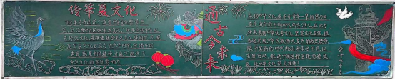 传统文化在心中,尺板方寸绘深情。各班认真组织,同学们积极参与,绘制出极具班级特色的中华优秀传统文化主题黑板报。各班级的黑板报主题鲜明,色彩搭配和谐自然,版面设计新颖独特,内容充实有吸引力,细腻的笔触镌刻下传统戏剧文化的绚丽篇章,艳丽的色彩绘制出民俗文化的绝美画卷,充分诠释了以爱国主义为核心的民族精神,充分展现了沉淀在国人心中的文化自觉与文化自信。