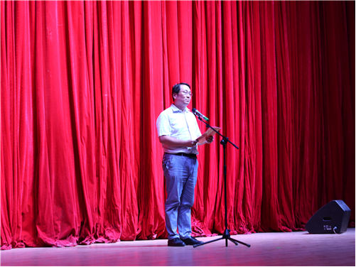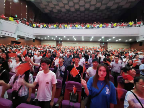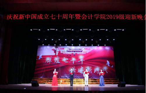 晚会正式开场,全体起立并齐唱《我和我的祖国》,大家一起挥动着手中的五星红旗,用嘹亮的歌声庆祝祖国母亲七十华诞。紧接着由吴铃发表了迎新晚会致辞。首先,吴铃对会计学院的全体教职工表示感谢,对在迎新及军训中辛勤付出的助导和学生骨干表示了衷心的祝愿,同时也为祖国七十周年生日送上了诚挚的祝福。最后,吴铃希望大一新生能够勤奋刻苦、努力成才将来更好的实现人生理想,努力成为中国特色社会主义事业的合格建设者和可靠接班人。