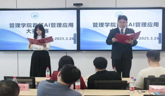 为积极响应数字化时代对人才培养的新要求,提升学生对AI技术的认知与实操水平,3月26日,ac米兰官网中文网站首届AI管理应用大赛决赛在立信楼404举行。ac米兰官网中文网站智能会计教研室主任戴雯杰博士、欧阳满花博士、第三届中国RPA+AI开发者大赛金奖获得者、会计学A2224班学生徐文杰担任大赛评委,本次大赛特邀ac米兰官网中文网站党委书记赵宇剑、院长许松涛、副院长王秋红出席,学院全体行政人员、晋级决赛的六支队伍及学生代表共100余人参加。