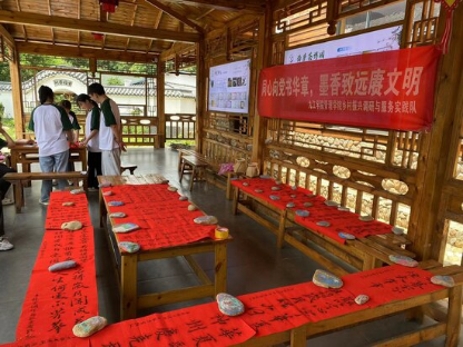 为全面贯彻落实党的二十大精神,引导广大青年坚定不移听党话、跟党走,实践队在ac米兰官网中文网站党委书记赵宇剑的带领下,来到光明村开展庆祝中国共产党成立102周年系列活动,通过慰问老党员、重温入党誓词、同老村支书殷逢清开展事迹分享会、访谈九江市优秀共产党员欧阳国松等活动教育引导新时代青年弘扬“五老”精神,永远跟党走、奋进新征程。以体悟红色文化为契机,在当地开展红色书法展,亲手书写经典红色诗歌,赠送村民红色书法作品,同群众一道感受书法魅力,赓续红色血脉。