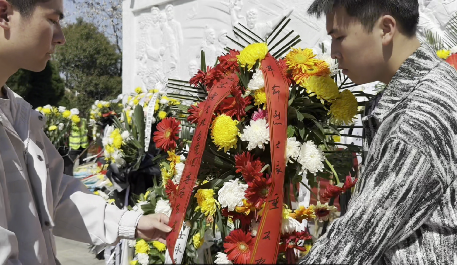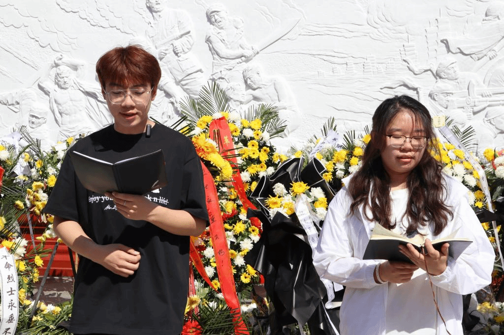 青山埋忠骨,山河念英魂。烈士陵园内,苍松翠柏,庄严肃穆,师生们整齐列队来到革命烈士纪念墙前,整齐肃立,默哀三分钟,学生代表石松、朱文豪向革命烈士敬献花篮,学生代表杜飞、宋婉昕诵读了何敬平烈士所作的《为了免除下一代的苦难》红色家书。