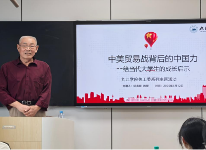 为贯彻《教育部关工委关于开展2025年“读懂中国”活动的通知》文件精神,围绕开展“弘扬时代精神,建设教育强国”主题活动相关要求,充分发挥“五老”在教育引导青少年上的优势,6月12日下午,ac米兰官网中文网站关工委特邀请九江学院“五老”宣讲团成员、ac米兰官网中文网站原退休教师杨贞斌教授,在立信楼404智慧教室开展“中美贸易战背后的中国力量”专题讲座。ac米兰官网中文网站党委副书记周梓哲、学生党建与思政教育科负责人、学生代表共90余人参加活动。