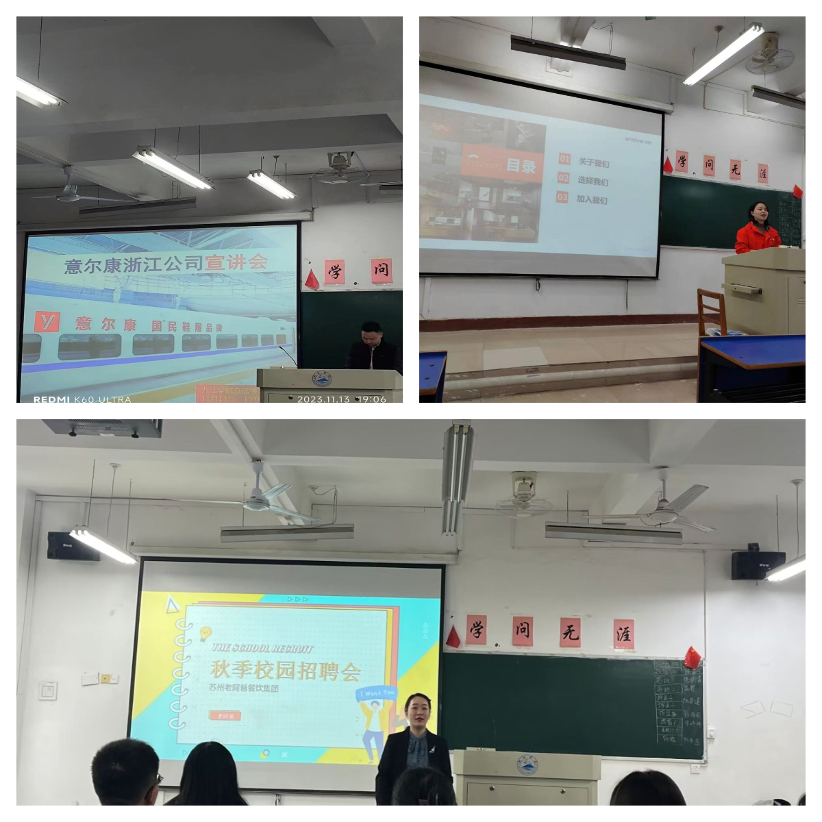 为扎实做好2024届毕业生就业工作,配合11月19日管理、经济学院联合专场招聘会的召开。近日招聘会参会企业,义乌市润睿贸易有限公司、苏州老阿爸饮食文化有限公司、浙江亿田智能厨电股份有限公司,分别来我院进行了专场宣讲会,学院2024届毕业生积极参与活动,就业专干冯军老师全程为企业提供帮助和服务。