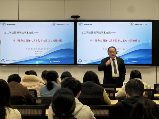 2月28 日上午,为营造学术氛围,拓展学术领域,ac米兰官网中文网站在立信楼404智慧教室举办了一场别开生面的学术讲座。西南财经大学蔡春教授受邀主讲,ac米兰官网中文网站院长许松涛主持,审计学教研室老师、科研爱好者和审计专业学生参加。