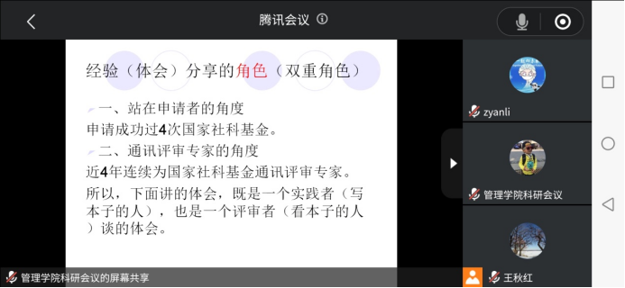 胡教授主要结合自己成功申请4次国家社科基金和连续4年作为国家社科基金通讯评审专家的经历,站在申请者和评审专家两个角度,给老师们分享了作为一个实践者写基金本子的经验,和作为一个评审者看基金本子的体会。