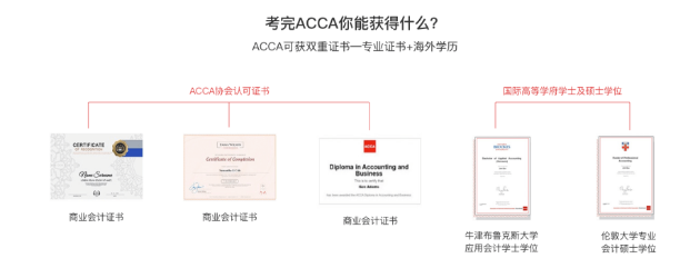 完成ACCA最后四门课程即可成为ACCA准会员,积累3年工作经验,可申请成为ACCA会员,继续积累5年相关工作经验,可申请成为FCCA资深会员ACCA会员完成牛津布鲁克斯大学的网络课程及论文,可获得牛布MBA硕士学位ACCA全科通过也可申请很多其他海外硕士