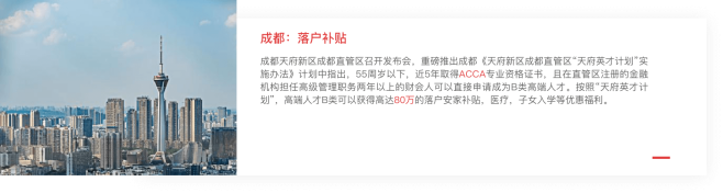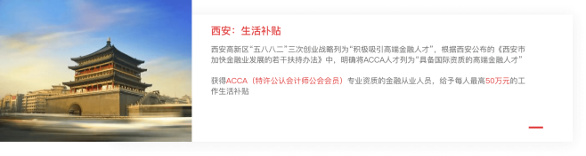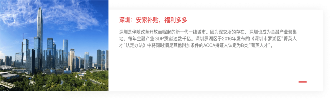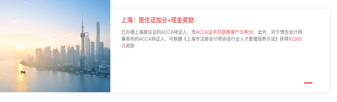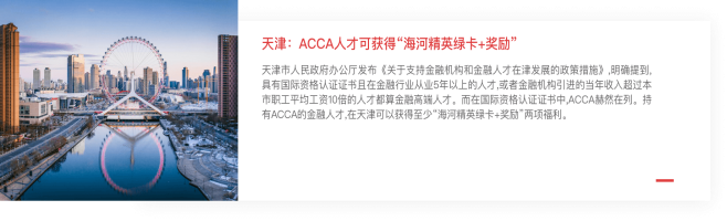 ACCA 会员资格在国内广泛被认可,多地政府都将 ACCA 持证人员列入稀缺性 高端财会人才,包括北京、上海、广州、深圳、成都、西安、重庆、天津、厦门、南昌等在内的各大城市相继出台各项优待政策,ACCA 持证人可享受诸如积分落户、 个税减免、专项奖金、置业补贴、子女入学等各项优待。部分城市 ACCA 人才优待政策如下: