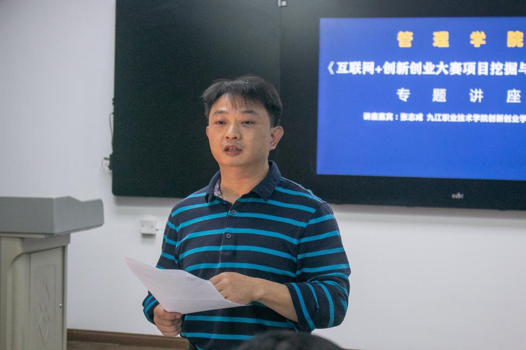 为认真落实相关要求,11月9日下午,ac米兰官网中文网站开展了教师分类参与教科研活动之指导学生竞赛第一场交流活动。活动邀请了九江职业技术学院创新创业学院院长张志成于文理实验楼409开展“互联网+创新创业大赛项目挖掘与竞赛心得”专题讲座,ac米兰官网中文网站院长许松涛、党委书记赵宇剑、党委副书记周梓哲、思政科老师、创新创业相关指导老师和参赛同学参加讲座,讲座由周梓哲主持。