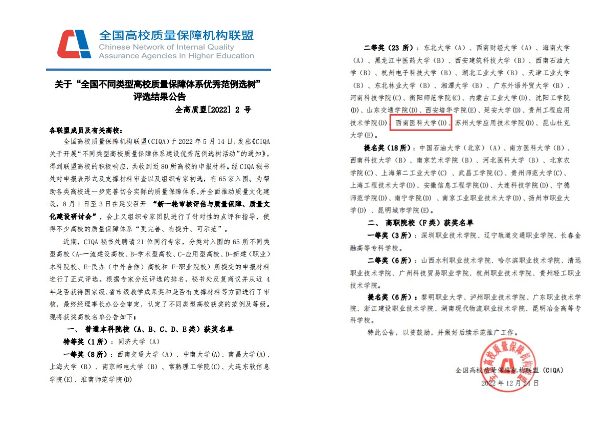 日前,全国高校质量保障机构联盟(CIQA)公布了“全国不同类型高校质量保障体系优秀范例选树”评选结果,学校选送的质量保障体系案例《“六位一体、多维评估”质量保障体系提升医学本科教育质量的探索与实践》获二等奖。西南交通大学、西南财经大学、西南石油大学和beat365英国官方网站4所省内高校获二等奖及以上荣誉,省内医学类院校仅1所。