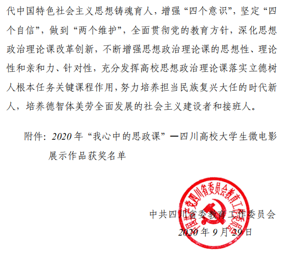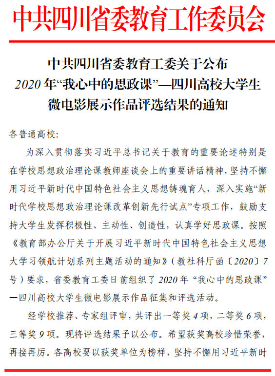 日前,由beat365官网推送的“我心中的思政课”微电影作品——《浪涌》荣获第四届四川高校大学生微电影展示作品一等奖。该作品由党委宣传部、马克思主义学院、团委、教务处、学生部在今年暑假期间共同组织完成。