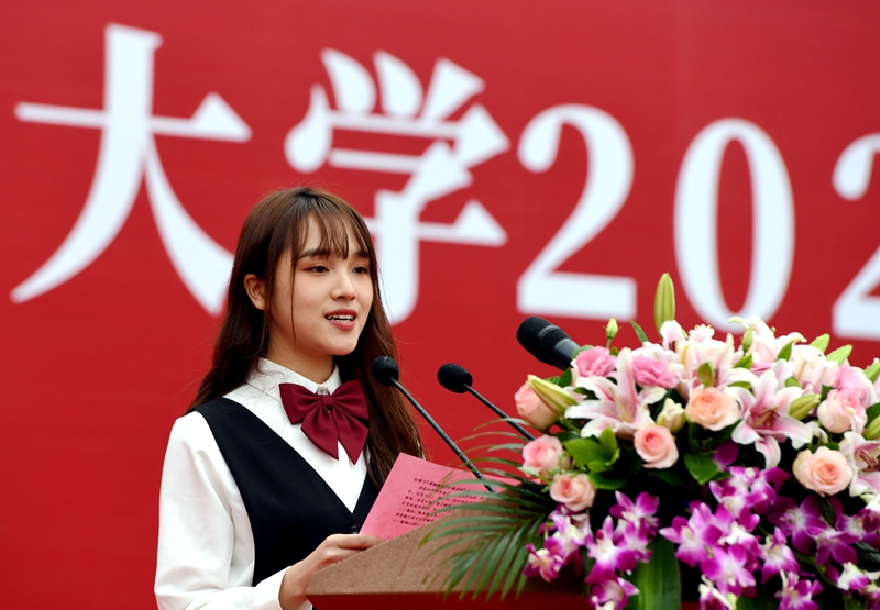 2019级临床医学专业学生、校学生会主席团成员鲁悦作为在校学生代表发言。她结合自身大学生活经历,鼓励学弟学妹们珍惜在西南医大的时光,勤学善思、求真向善、勇于拼搏、追求卓越,把小我融入大我,把青春献给祖国,用凌云之志点亮未来。