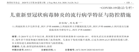 佘佳桐还以第一作者身份在《热带医学杂志》2020,20(2):153-156发表题为“儿童新型冠状病毒肺炎的流行病学特征与防控措施”论文。两篇论文对儿童COVID-19的防治具有积极意义。