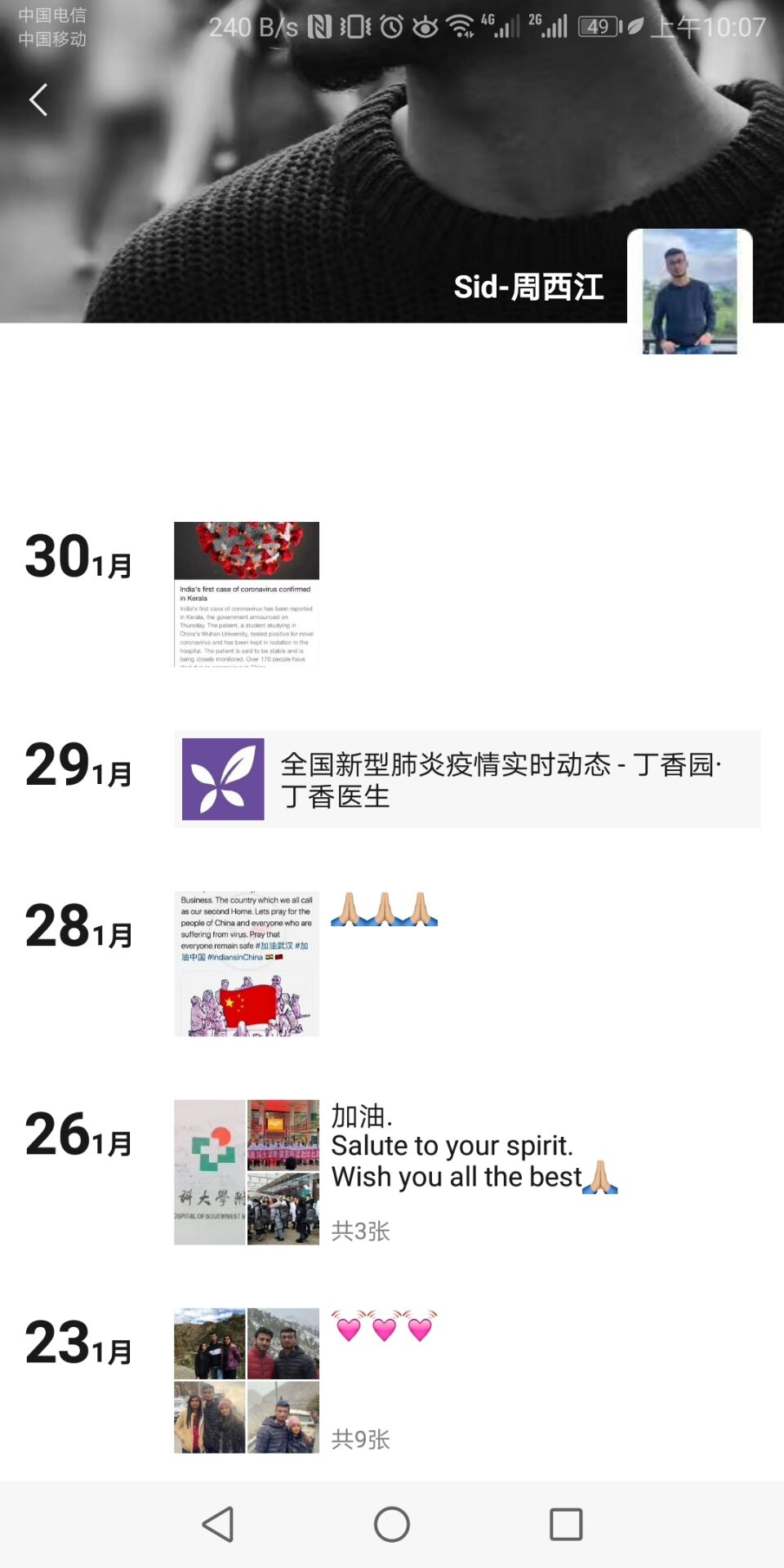 印度籍留学生周西江在他的社交账号转发了一张写有如下文字的图片“我们为中国,这个为我们提供了良好的学习与工作的国家,也被我们称作第二故乡的国家祈祷。让我们为中国人民还有其他正在中国遭受病毒考验的人们祈祷,希望所有人都能平安无恙#加油武汉 #加油中国 #印度中国”。
