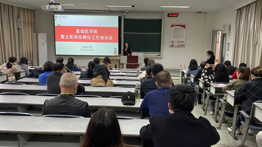3月30日下午,基础医学院在鸿文楼201教室召开第五轮岗位聘任培训会,会议采取线上和线下相结合的形式召开。学院处科级干部、各科室主任、教学秘书参加现场会议,全院教职工通过在线直播形式参会。学院党委书记阳静主持会议。