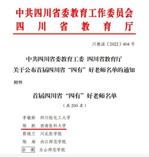 为大力宣传和热烈庆祝第38个教师节,充分展示新时代人民教师教书育人的动人风采和先进事迹,进一步营造全社会尊师重教的浓厚氛围,不断激励广大教师以实际行动迎接党的二十大胜利召开,近日,四川省教育厅公布了首届四川省“四有”好老师评选结果,全省200名教师获评首届四川省“四有”好老师,beat365官网医学影像系陈跃教授榜上有名。