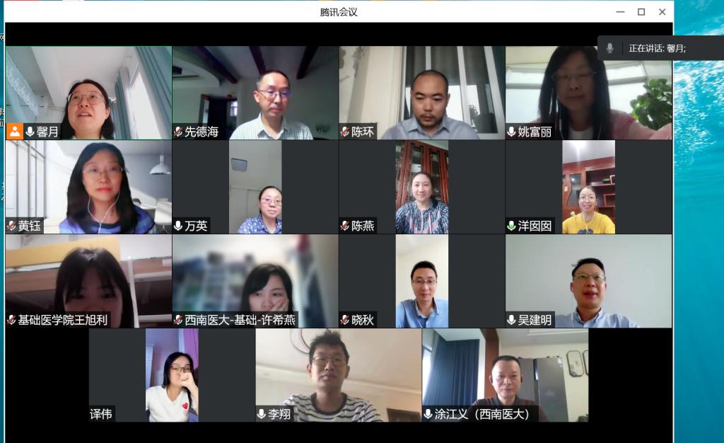 9月9日上午,基础医学院采取线上慰问方式,通过腾讯视频会议对在教学、科研、管理工作中表现突出的教师代表以及家庭困难的教师代表进行慰问。学院党委书记阳静,院长吴建明,党委副书记黄钰,副院长涂江义、谭晓秋,党政办、学科建设办、教务科、基础办负责人参加了会议。教师代表共7人:陈燕、万英、先德海、陈环、李翔、陈蓉、姚富丽参会。会议由阳静主持。