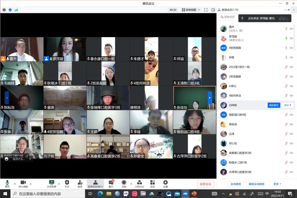 9月11日晚,口腔医学院2022级新生年级大会通过线上会议的形式举行,会议由口腔医学院学生科科长罗茂璇和团总支书记雷杰主持,2022级全体新生参会。